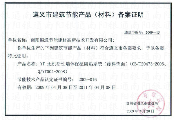 遵義市建筑節(jié)能產(chǎn)品(材料)備案證明南陽銀通