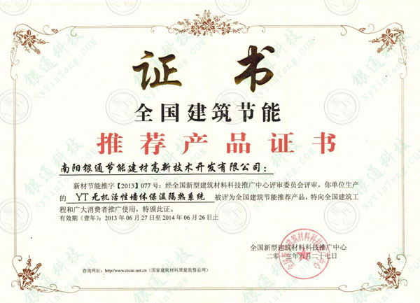 新材節能推字【2013】077號:經全國新型建筑材料科技推廣中心評審委員會評審,你單位生產的YT無機活性墻體保溫隔熱系統被評為全國建筑節能推薦產品,特向全國建筑工程和廣大消費推廣使用,特頒此證。
