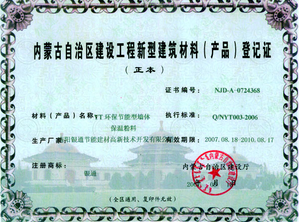 2007年內蒙古省建筑節能產品核準證書