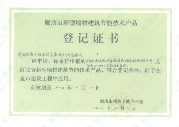 河北廊坊市新型墻材建筑節能技術產品登記證書
