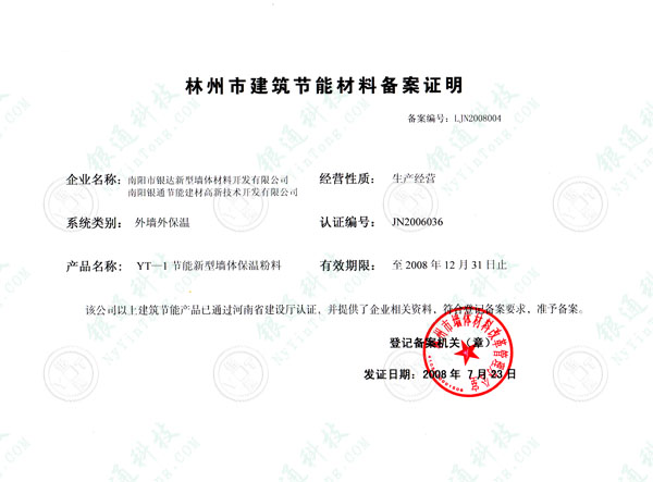 河南省林州市建筑節能材料備案證明  備案編號LJN2008004 企業名稱南陽銀通節能建材高新技術開發有限公司 南陽市銀達新型墻體材料開發有限公司 產品名稱YT-1節能新型墻體保溫粉料YT無機活性墻體保溫隔熱系統  系統類別外墻外保溫 規格型號YT-A 產品型號50kg/袋注冊商標銀通 銀達 有效期限2008年12月31日 該公司以上建筑節能產品已通過河南省建設廳認證 并提供了企業相關資料 符合登記備案要求 準予備案 登記備案機關 林州市墻體材料改革管理辦公室 發證日期2008年7月23日