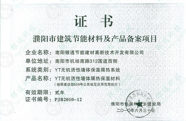 河南省濮陽(yáng)市建筑節(jié)能材料及產(chǎn)品備案證書(shū)