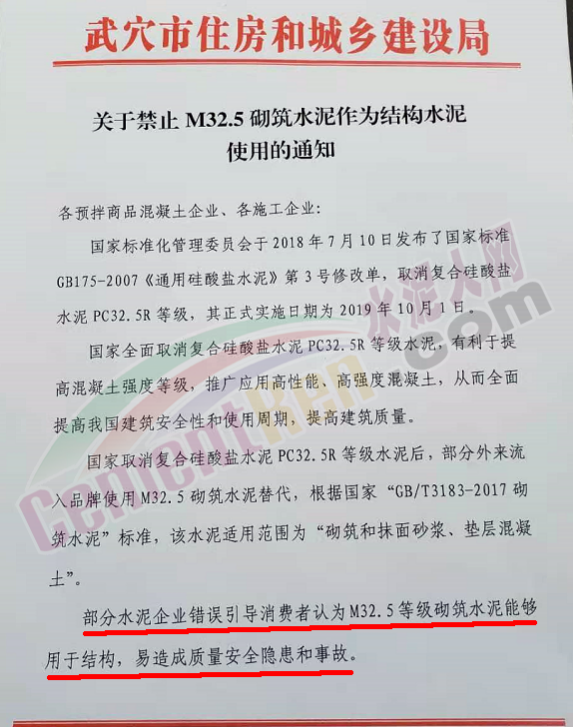 日前,湖北省武穴市住房和城鄉建設局發布《關于禁止 M32.5 砌筑水泥作為結構水泥使用的通知》給各預拌商品混凝土企業、各施工企業稱,國家標準化管理委員會于2018年7月10日發布了國家標準 GB175-2007《通用硅酸鹽水泥》第 3號修改單,取消復合硅酸鹽水泥PC32.5R 等級,其正式實施日期為 2019 年 10月1日。