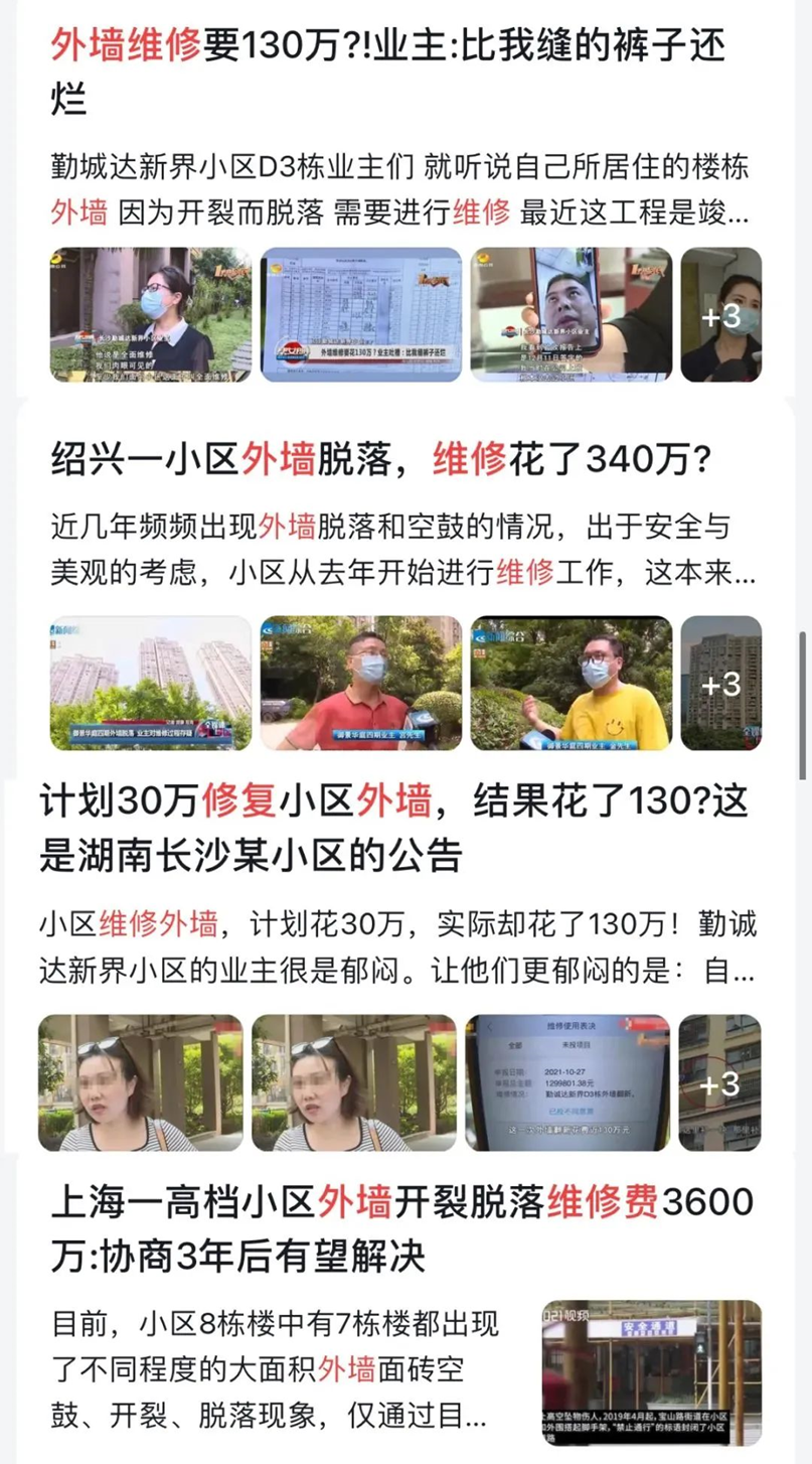 梳理近年被爆出的關(guān)于住宅維修的民生新聞可以看出,目前我國大部分的住宅后期維修費(fèi)都貴得讓業(yè)主們難以接受。比如,長沙某小區(qū)樓體維修需花835萬;紹興某小區(qū)外墻空鼓維修花了340萬;南寧某小區(qū)外墻維修費(fèi)用開出2979萬高價;就連幾塊瓷磚脫落,廣西某小區(qū)也開出了6500元的維修費(fèi)........