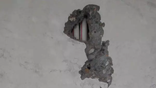 分析:墻面空洞很明顯是由于建造時(shí)在刷墻階段混入了垃圾造成的,可以看見(jiàn)里面有廢棄的鐵絲。